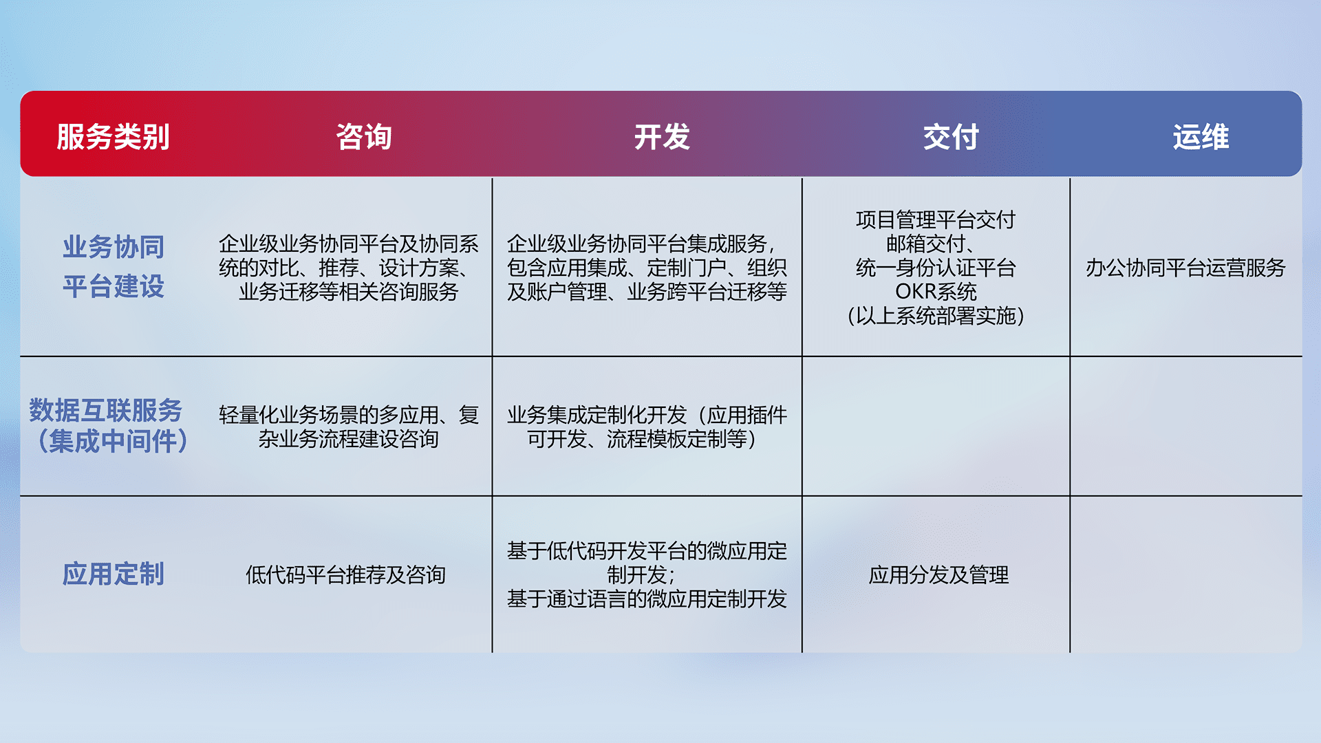 针对钉钉、、、、企微、、、IDaas等平台级产品提供产品的规划、、、、方案、、、交付、、定制化开发等服务,,,实现如统一协同办公、、、、智能客户服务、、、混合会议管理、、智能数据查询、、、等业务场景,,,实现数字化转型。。