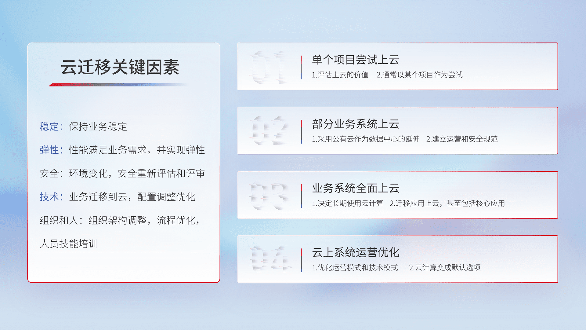 结合实际业务,,,从规划设计、、、云平台选型、、、、云原生改造、、、数据迁移、、集成交付,,,,迁移全过程为客户识别最佳上云路径,,,做好风险识别管理,,设计网络架构、、、身份权限、、、安全审计合规、、、、操作审计、、日志审计、、、监控告警策略、、多站点容灾设计等,,,对云上基础设施进行整体规划,,,提升IT治理水平,,,,以满足弹性、、、高可用、、高性能的需求。。